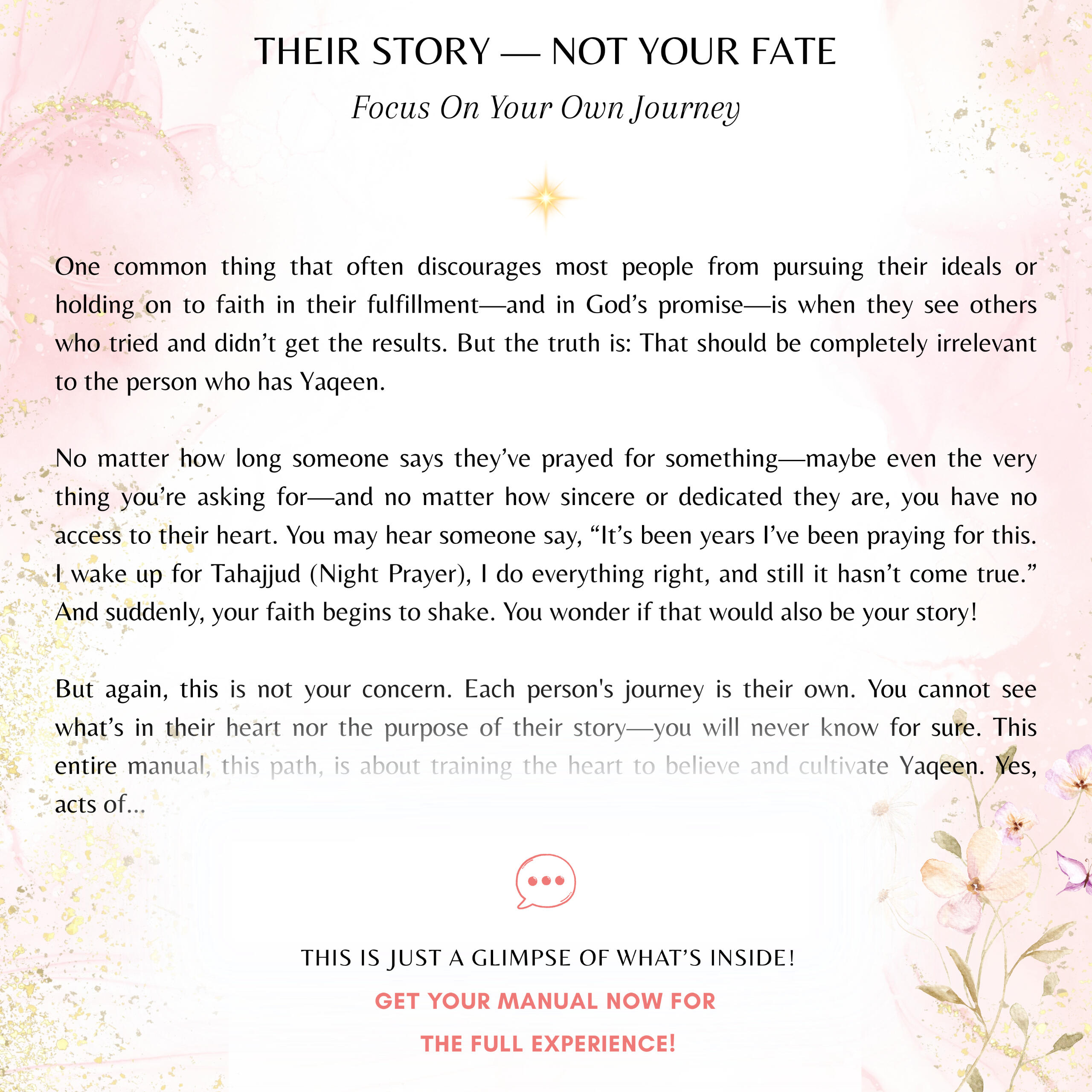 Each section of this manual has been crafted to guide you towards unwavering faith - Yaqeen, helping you quiet the fears and doubts to align your heart with divine certainty and experience blissful anticipation of your Answered Prayer. Here’s what awaits you: